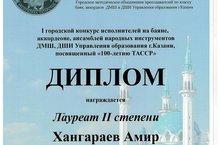 В феврале 2021 года прошел I городской конкурс исполнителей на баяне, аккордеоне, ансамблей народных инструментов ДМШ, ДШИ Управления образования г.Казани, посвященный «100-летию ТАССР», в котором учащийся нашей школы Хангараев Амир, преп. Халитова Ильмира Рафкатовна, стал Лауреатом 2 степени.