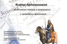 26-27 сентября прошел Международный фестиваль средневекового боя "Великий Болгар". За активную помощь в организации и проведении фестиваля была выражена Благодарность Артамоновой Ксении Михайловны.