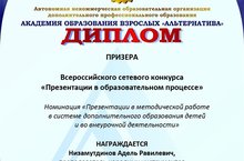 В октябре 2020 года прошел Всероссийский сетевой конкурс "Презентация в образовательном процессе". Преподаватель нашей школы, Низамутдинов Адель Равилевич, был награжден Дипломом призера в номинации "Презентации в методической работе в системе дополнительного образвования детей и во внеурочной деятельности".