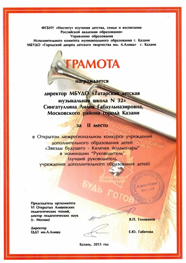 директор школы Сингатуллина Л.Г. стала Лауреатом II степени Открытого межрегионального конкурса учреждений дополнительного образования детей «Звезды будущего – Киләчәк йолдызлары» в номинации «Руководитель» (лучший руководитель УДОД).