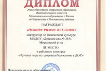 Диплом за III место в районном конкурсе "Лучшая игра по здоровьесбережению в ДОУ".