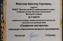 Наш музыкальный руководитель Морозова Кристина Сергеевна заняла 3 место, в районном конкурсе профессионального мастерства музыкальных руководителей "Симфония мастерства" в номинации "Законченное авторское произведение" Поздравляем! Пусть эта победа не будет последней, пусть каждое ваше старание и упорный труд обязательно приводят вас к призовым местам и заслуженным наградам.