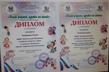 По итогам Республиканского конкурса «Язык родной, дружи со мной!», посвященного Международному дню Родного языка, воспитанники нашего Детского сада Ахмадиева Люция, куратор учитель – логопед Нафикова Р.Р, и Полякова Нелли, кураторы – воспитатели Хазиева Э.У. и Салимова Ф.Ш. , получили дипломы 1 степени ! Поздравляем всех с победой!