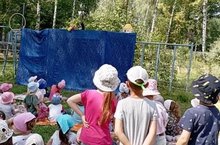 В летне-оздоровительный период кукольный театр у нас проходит на свежем воздухе. Представления вызывают у детей восторг и массу положительных эмоций. Сегодня воспитатели организовали кукольный театр "Кот, лиса и петух" для воспитанников всех возрастных групп на свежем воздухе во время прогулки. Дети с интересом наблюдали за героями сказки!