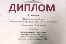 Педагогический коллектив нашего детского сада, получил Диплом 1 степени за участие в IX городском конкурсе инновационных программ и проектов в номинации "Дошкольное образование". Желаем новых достижений в профессиональной деятельности!