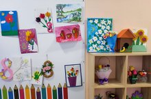 В холле нашего детского сада выставка рисунков и поделок посвященная 8 Марта и Весне.