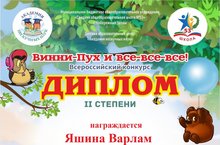 Поздравляем Яшина Варлама с победой во Всероссийском конкурсе "Винни - пух и все - все- все! " в номинации рисунок, под руководством педагога Саттаровой Л.З.
