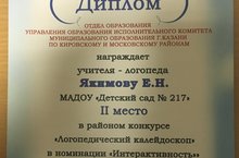 Спешим поздравить учителя - логопеда нашего детского сада, Якимову Екатерину Николаевну, за участие в конкурсе "Логопедический калейдоскоп", занявшую 2 место в номинации "Интерактивность"