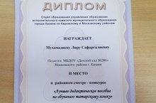 Поздравляем Мухамадиеву Л.С., которая приняла участие в районном смотре-конкурсе "Лучшее дидактическое пособие по обучению татарскому языку" и награждена дипломом за II место. Желаем новых побед!