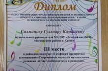 Поздравляем Салманову Г.К. муз. руководителя, которая приняла участие в районном конкурсе "Симфония мастерства" и была награждена дипломом за III место. Желаем дальнейших успехов и новых побед!