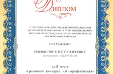 Поздравляем Трифонову Е.А. воспитателя подготовительной группы №5, которая приняла участие в районном конкурсе "Я - профессионал" и была награждена дипломом за II место. Желаем дальнейших успехов и новых побед!