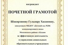 Поздравляем Шакирзянову Гульнару Xасановну заведующую МБДОУ "Детский сад № 286" с почетной грамотой за эффективную деятельность в управлении дошкольным образовательным учреждением.