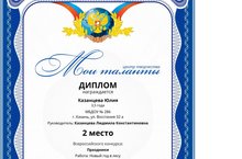 Поздравляем Казанцеву Юлию, воспитанницу нашего детского сада из младшей группы, занявшей 2 место во Всероссийском конкурсе "Мои таланты" - Новый год в лесу. Руководитель Казанцева Л.К.