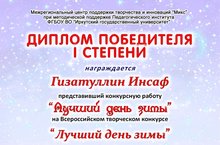Поздравляем Гизатуллина Инсафа, воспитанника нашего детского сада из средней группы № 3 , представивший конкурсную работу "Лучший день зимы" на Всероссийском творческом конкурсе и был награжден дипломом победителя 1 степени.