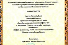 Поздравляем воспитанника группы № 1 Каргина Арсения и воспитателя группы Лукоянову Марину Андреевну занявшим 3-место в районном конкурсе детских работ "Калейдоскоп российских мультфильмов" номинации "Творчество детей и взрослых!!!!