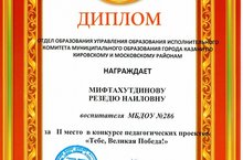 Поздравляем нашего педагога группы № 6 Мифтахутдинову Резеду Наилевну, воспитателя первой кв.категории с победой в районном конкурсе педагогических проектов "Тебе, Великая Победа", занявшей ВТОРОЕ место. Желаем Вам творческих успехов и новых побед!!!
