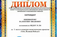 Поздравляем педагога группы № 6 Никифорову Валентину Ивановну воспитателя высшей кв.категории занявшей 1 место в районном конкурсе педагогических проектов "Тебе, Великая Победа!"".Желаем Вам успехов в работе и новых побед!