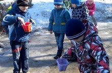 Мы уже совсем Большие! Подготовительная группа посыпает дорожки песком и помогает раскидывать снег на участке младшей группы.