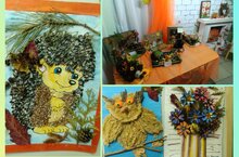 Традиционная осення выставка поделок из природного материала и продуктов урожая разместилась в фойе детского сада. В фото -зоне теперь стоят поделки ребят сделанные совместно с родителями.