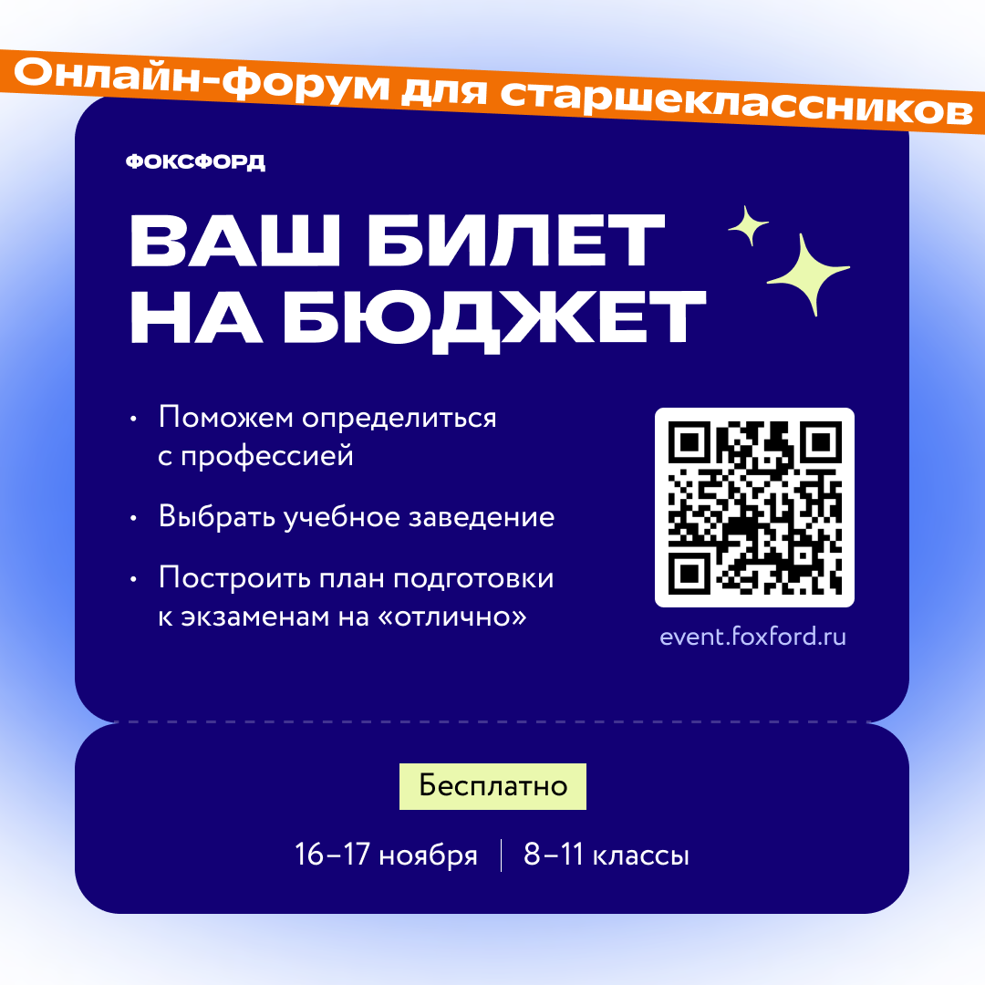 Опубликовано: 15.11.2024Онлайн-школа «Фоксфорд» приглашает всех старшеклассников принять участие в онлайн-форуме «Ваш билет на бюджет». Преподаватели и эксперты по поступлению расскажут, как сдать экзамены на высокие баллы и найти профессию мечты.