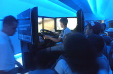 В этом вагоне особой популярностью у наших ребят пользовались несколько тренажеров, в том числе обучающий тренажер машиниста электровоза ЭП1М. Кресло машиниста этого тренажёра установлено на динамической платформе. Каждый, кому удалось встать за пульт управления, испытывал удивительные ощущения восторга и невероятной ответственности. Динамический тренажер, созданный на базе автомобиля «КамАЗ», имитирующий приборное оборудование кабины, характерные шумы, а также мультимедийный лазерный тир очень понравился ребятам, многие из которых задумались о труде машиниста.