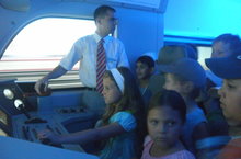 Экспозицию вагона составляют макеты современных локомотивов, вагонов, путевой и другой железнодорожной техники. Воспитанники лагеря с интересом наблюдали за подвижными макетами - панорамами, которые показывают устройство станций, железнодорожных переездов, тяговой подстанции и других инфраструктурных объектов железной дороги.