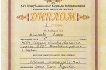 Поздравляем Малькову Алину, ученицу 11Б класса, получившую диплом II степени на XVI Республиканских Кирилло-Мефодиевских юношеских научных чтениях в номинации "Русская литература" (9-11 кл.). Научным руководителем Мальковой А. является Сухая Ольга Андреевна, учитель русского языка и литературы высшей квалификационной категории, кандидат педагогических наук.