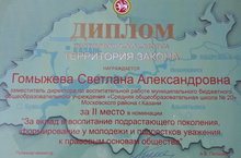 Поздравляем Светлану Александровну Гомыжеву, заместителя директора по воспитательной работе, завоевавшую 2 место в номинации "За вклад в воспитание подрастающего поколения, формирование у молодёжи и подростков уважения к правовым основам общества" Республиканского конкурса "Территория закона".