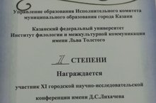 22.02.2017 Аникина Юлия, ученица нашей школы, приняла участие в XI городской научно-практической конференции им. Д.С. Лихачева, где заняла 2 место. Поздравляем призёра и научного руководителя Юлии – Сухую Ольгу Андреевну, учителя русского языка и литературы высшей квалификационной категории, кандидата педагогических наук.