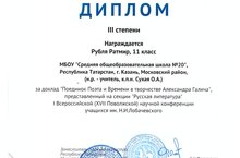 Поздравляем ученика 11 класса Рублю Ратмира, занявшего III место на I Всероccийской (Поволжской) научной конференции учащихся им. Н.И. Лобачевского с исследовательской работой «Поединок Поэта и Времени в творчестве Александра Галича». Желаем дальнейших успехов!