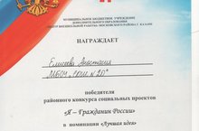 Поздравляем победителя районного конкурса социальных проектов «Я – гражданин России» Елисееву Анастасию в номинации «Лучшая идея». Надеемся, что предложенный нами социальный проект «Старым вещам – новую жизнь» поможет преобразить окружающее пространство в нашей школе.