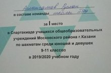 Поздравляем с победой наших ребят из 8К класса в Спартакиаде по шахматам среди юношей и девушек 9-11 классов Московского района г.Казани! Молодцы!