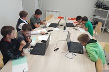 Робототехника түгәрәгендә балалар узләре төзегән роботларны "Сумо" ярышында сынап...