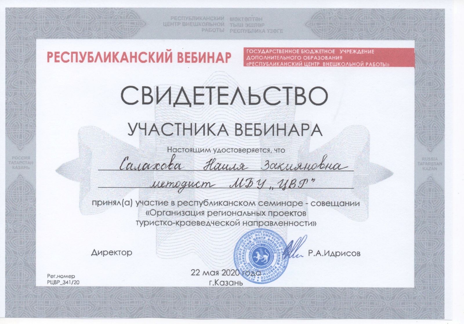 Свидетельство за участие в вебинаре Нафикова Л.Р.