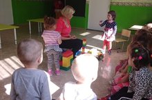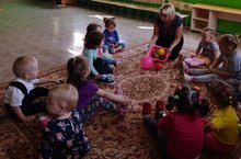 Муслюмовский детский сад "Карлыгач", первая младшая группа совместно с воспитателем познакомились с мячем. Дети научились различать мяч по цвету и форме.