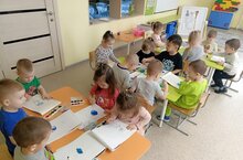 Кечкенәләр төркеме балалары белән "Юл йөрү кагыйдәләрен" өйрәнүне дәвам итеп светофор төсләрен туры китереп буядык.
