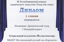 Театральный коолектив МБДОУ "Карлыгач" "Йолдызчыклар", на III Республиканском конкурсе сценического искусства "Театр как театр", были награждены Дипломом первой степени в номинации: "Драматический театр". Руководитель Гульнар Фархутдинова.
