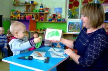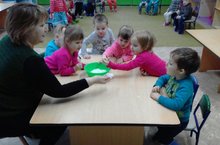 В процессе действий с предметами ребёнок учится различать их форму. Малыша необходимо научить таким действиям, при котором он мог бы понять, что от умения определять форму зависит результат его деятельности. Поэтому первые игры и упражнения должны быть основаны на практических действиях, требующих опоры на форму предметов. Ребёнок может ещё не выделять форму зрительно и тем более не знать её названия. Способом ориентировки в задании являются здесь пробы, которым нужно научить ребёнка. Воспитатель первой младшей группы Лайсира Индусовна учит детей с помощью дидактических игр. Например игра: "Найди такой же предмет".