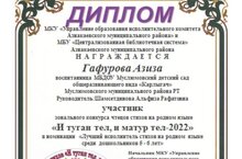 Гафурова Азиза и Музипова Илиза успешно выступили на конкурсе, организованный Азнакаевским муниципальным районом, "И туган тел, и матур тел - 2022". Девочки были награждены дипломами. Молодцы!