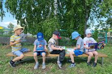В рамках года родных языков и народного единства, дети подготовительной группы не забывают о знаниях, увлекаясь игрой в летний солнечный день. Дети совмещают приятное с полезным. Они продолжают знакомиться с газетами и журналами, издаваемыми татарским издательством, на свежем воздухе.