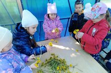 В средней группе "День одуванчика". С детьми расширяли знания об одувпнчиков. Познакомились с понятием"лекарсвенное растение". Дети попробовали сплести веночки. После прогулки выполняли коллективную работу на тему"Полянка одуванчиков".Используя нетрадиционный способ рисования-штампами из картонных трубочек.