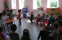 Мослим авылы "Карлыгач" балалар бакчасы, беренче кечкенэлэр торкемендэ уен "Бу ойдэ нэрсэ яши?". Балаларны теге яки бу предметнын исемен эйтеп табарга ойрэту, хайваннарга ярату хисе тэрбиялэу.
