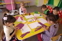Воспитанники средней группы учатся пользоваться ножницами: правильно держать ножницы, сжимать и разжимать кольца, резать по прямой. Воспитатель Ч.Хафизова учит детей выкладывать узоры из бумажных полосок, закрепляет приемы аккуратного наклеивания.