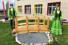 Территория детского сада оформлена в национальном стиле. т.к. основное направление деятельности МБДОУ "Кояшкай" - "Национально-патриотическое воспитание дошкольников на основе принципов нардной педагогики" и он является базовым детским садом по национальному воспитанию дошкольников.