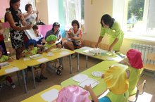 Воспитатель первой квалификационной категории Хабирова Индира Рифовна проводит с детьми мастер-класс по рисованию татарского национального узора с помощью нетрадиционной методики "Эбру" (методика рисования на воде "Танцующие цветы"). Гости конференции с интересом и восхищением наблюдали за работой воспитанников, а некоторые гости даже сами приняли участие в рисовании.