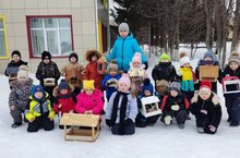 Мәктәпкә әзерлек төркеме балалары "Кошларга ярдәм ит" акциясендә катнашалар. Алар әти-әниләре белән бергәләп кошлар өчен җим салу тартмалары алып киләләр, анда азыклар салып торалар.