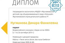 Воспитатель МБДОУ "Кояшкай" Нугманова Динара Фанилевна стала лауреатом всероссийского конкурса "Зирәк остаз-XXXX" в номинации "Сценарий праздника" с авторской разработкой "Төкле аягың белән, Көз кызы Сөмбелә". Организатор конкурса - журнал Гаилә һәм мәктәп". Поздравляем Динару с победой в конкурсе.