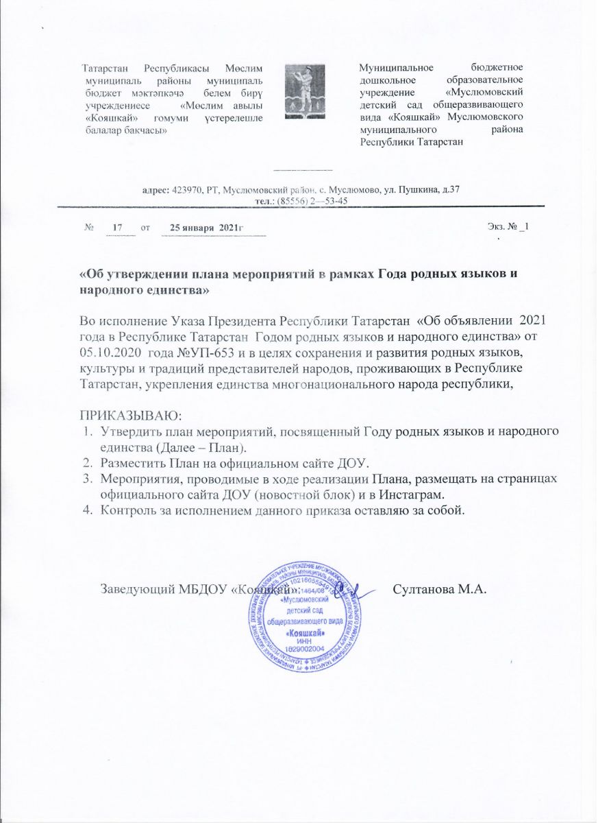 Приказ "Об утверждении плана мероприятий в рамках Года родных языков и народного единства"