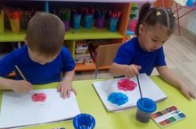 Икенче кечкенәләр төркемендә "Күңелле түгәрәкләр" исемле рәсем шөгыле. Балалар төсләрне аерырга, сызылган түгәрәк эченнән чыкмыйча буярга өйрәнәләр.