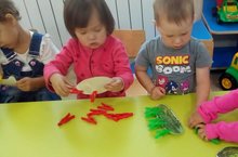 В рамках недели "Наступила осень", дети первой младшей группы играли в дидактическую игру "Найди такой же цвет". Они называли овощи и фрукты, при этом находя подходящую по цвету прищепку.При этом развивается мелкая моторика рук.
